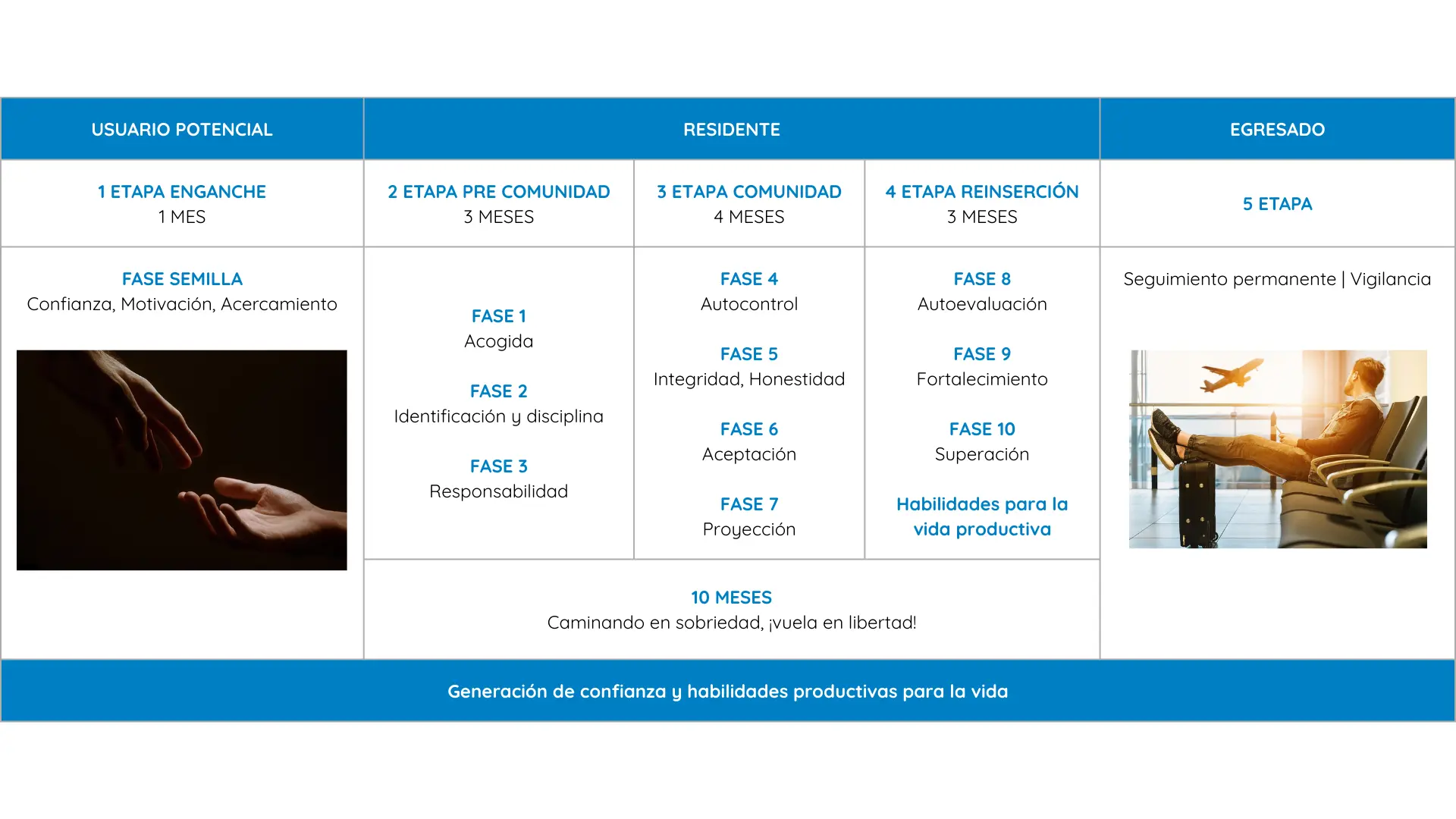 La fundación garantiza que las personas en recuperación tengan acceso a una amplia gama de recursos, servicios, cursos integrales que apoyen su proceso de recuperación. Esto puede incluir terapia individual y grupal, programas de tratamiento residencial, asesoramiento legal y de orientación para el empleo, entre otros.